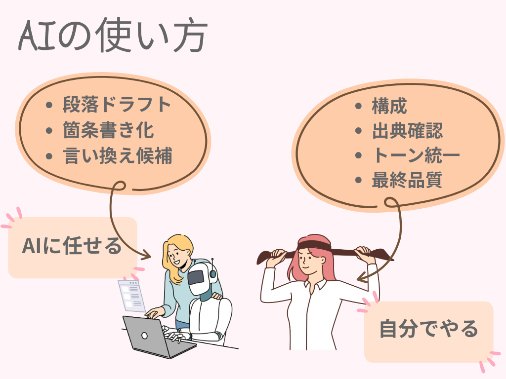 AIは「前処理(下書きのたたき台づくり)」に使い、構成・出典確認・最終品質は必ず自分で担いました。