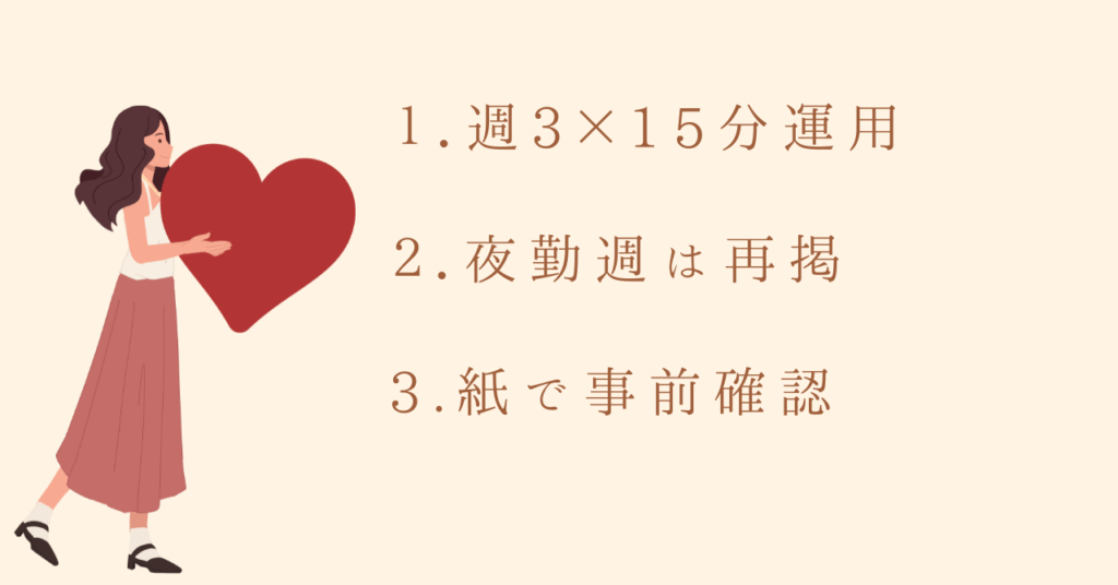 • 夜勤週は新規ゼロでもOK。再掲・まとめ投稿で負荷分散