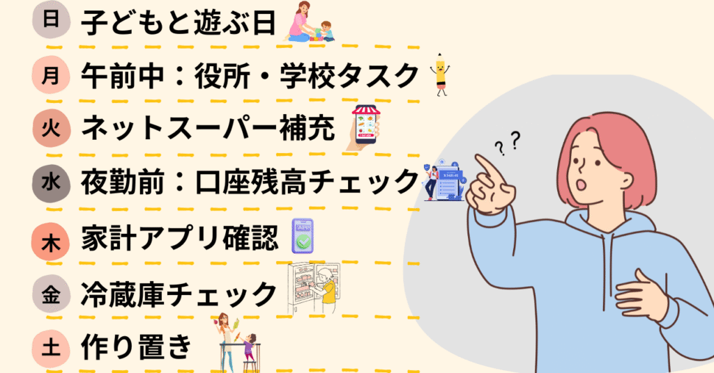 ・日勤週:火=ネットスーパー補充/木=家計アプリ確認/土=作り置き