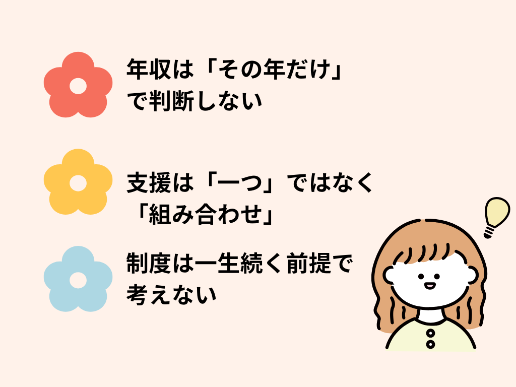 大切なのは、「今の年収=すべての支援が使えない」と決めつけないことです。